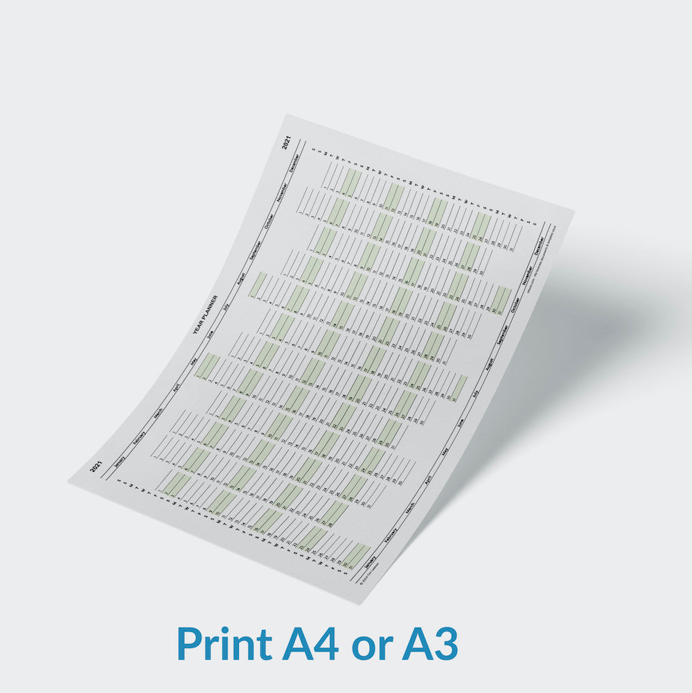 A 2021 printable year planner calendar download. The file is in high quality PDF format and you can print as many year planners as you like from the file. The file prints at both A4 and A3 sizes via Adobe Reader (free) or the PDF viewer installed in your operating system.
