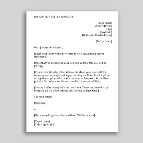 An editable Word template to create a letter of resignation to end an employment. This is to be used by employees who want a clear and professional letter to give to their employers when resigning or quitting a job.
