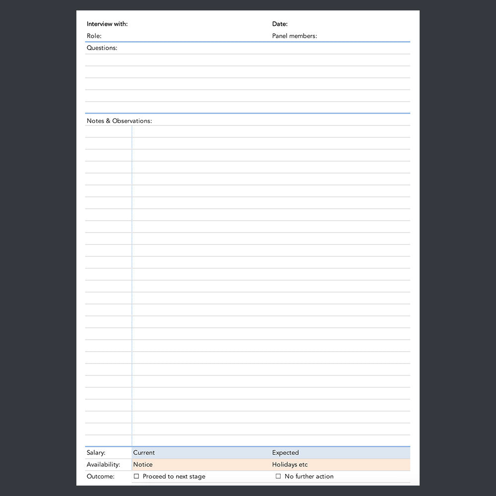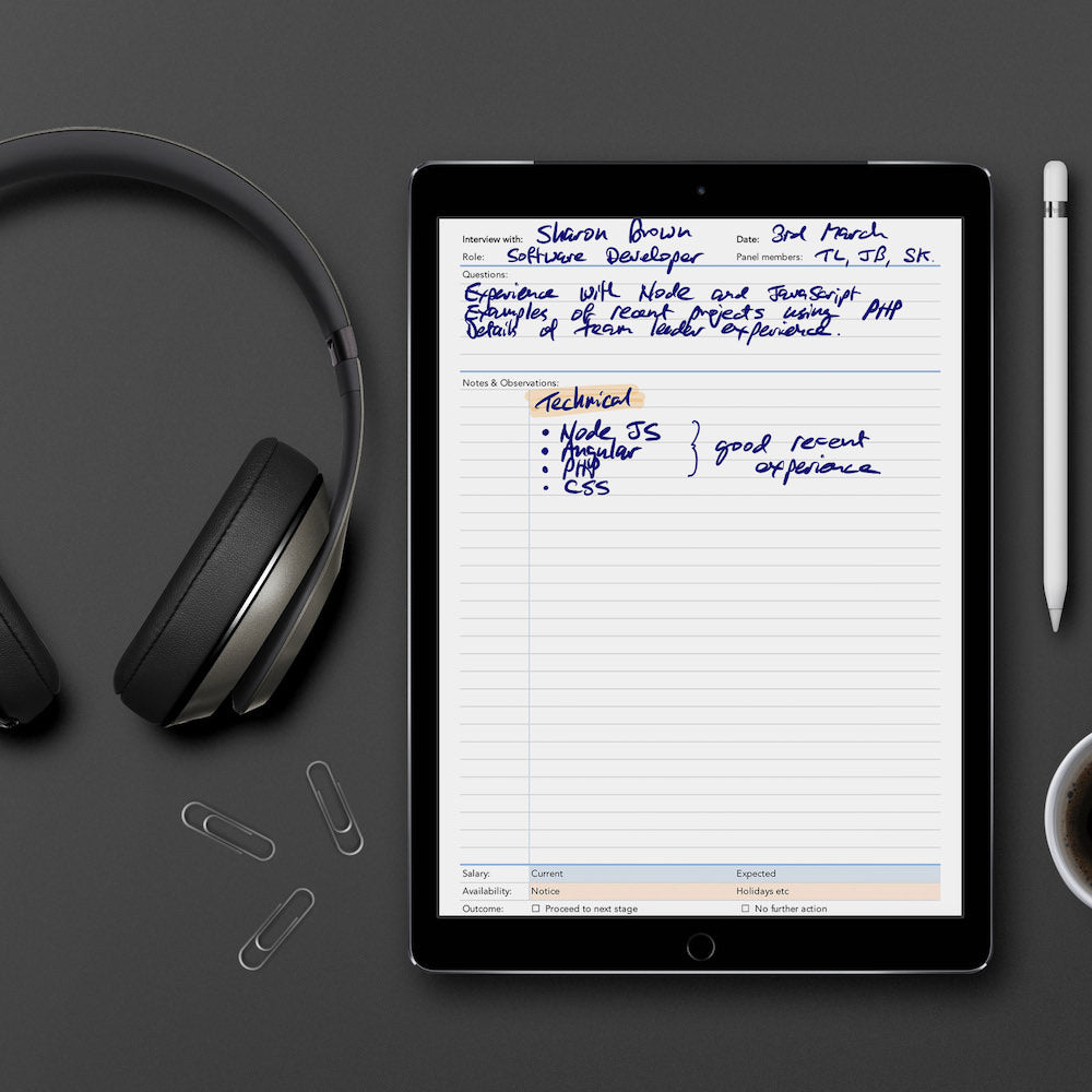 This PDF interview notes template can be used to drive your 'paperless' workflow by importing into iPad or tablet apps and written over using an Apple Pencil or stylus.