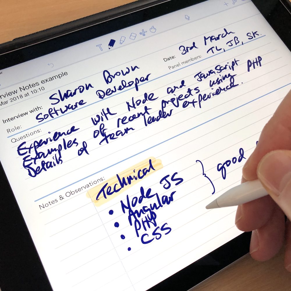 There are a range of note taking apps which allow a PDF template to be used underneath the hand written notes. This enables a paperless workflow to be created meaning that you will capture and store your interview notes without paper.